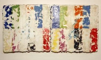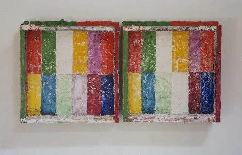 Beginning in the 90’s, he made several trips to India, where the brilliant colour he saw all around him found its way into his paintings, some of which also contained commonplace objects such as egg boxes and even urinals, which he transformed into brightly patterned protrusions from the pegboard base.